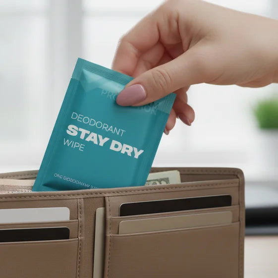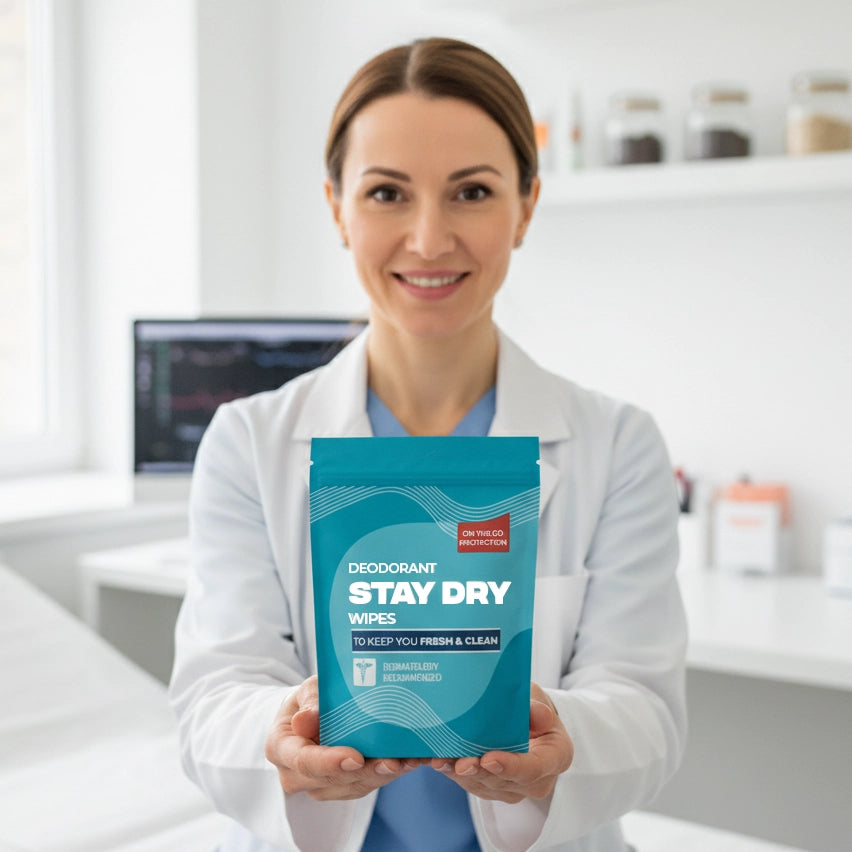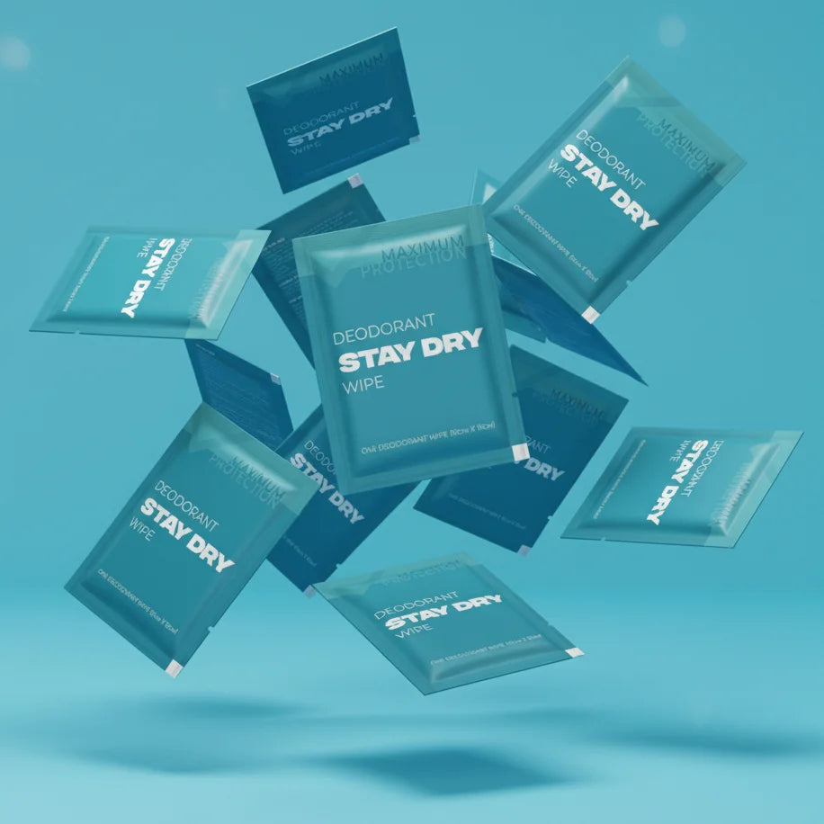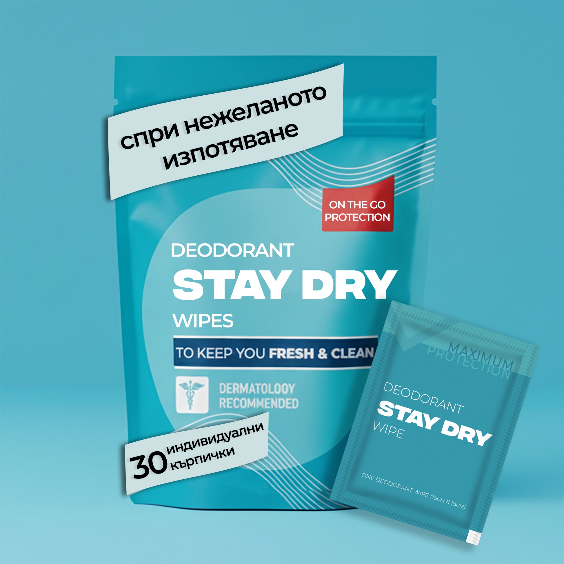 Stay Dry са индивидуално опаковани дезодорантни кърпички, които осигуряват бърза свежест и контрол върху потта и миризмата. Те съдържат естествени абсорбиращи и ароматизиращи съставки и са подходящи за всички типове кожа.